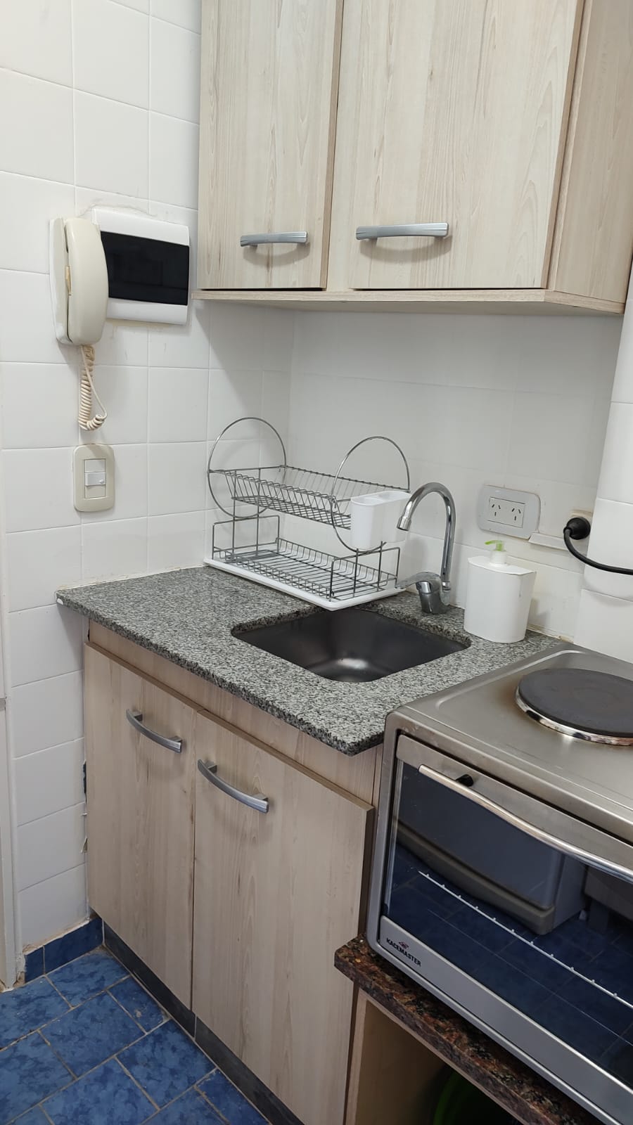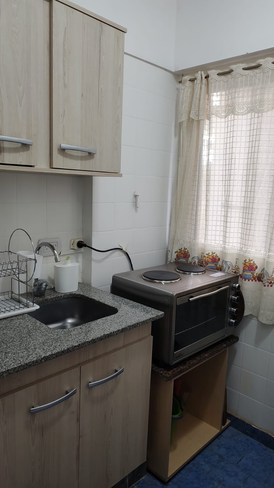 Cocina, pequeña pero bien ventilada y equpada. Bacha, bajomesada, anafe 2 hornallas, hornito eléctrico, pava eléctrica, heladera con freezer y termotanque eléctrico.