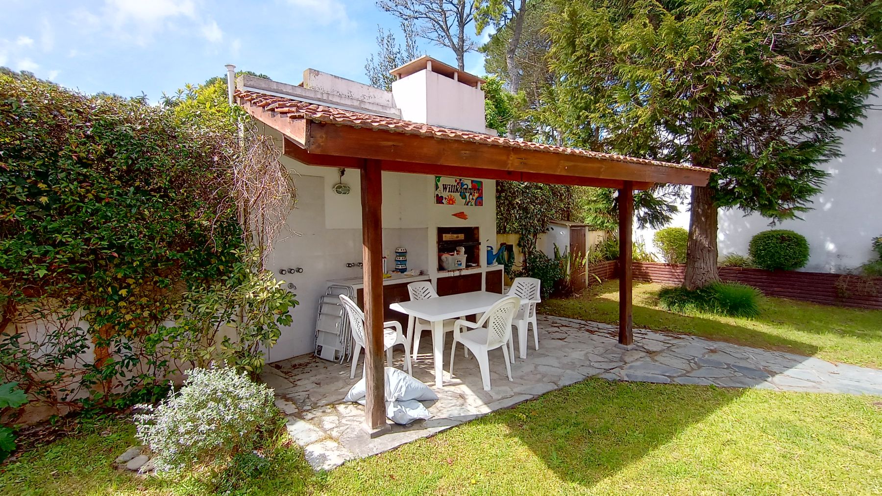 Zona de quincho en espacio semicubierto afuera en el jardín, muy bien puesto.