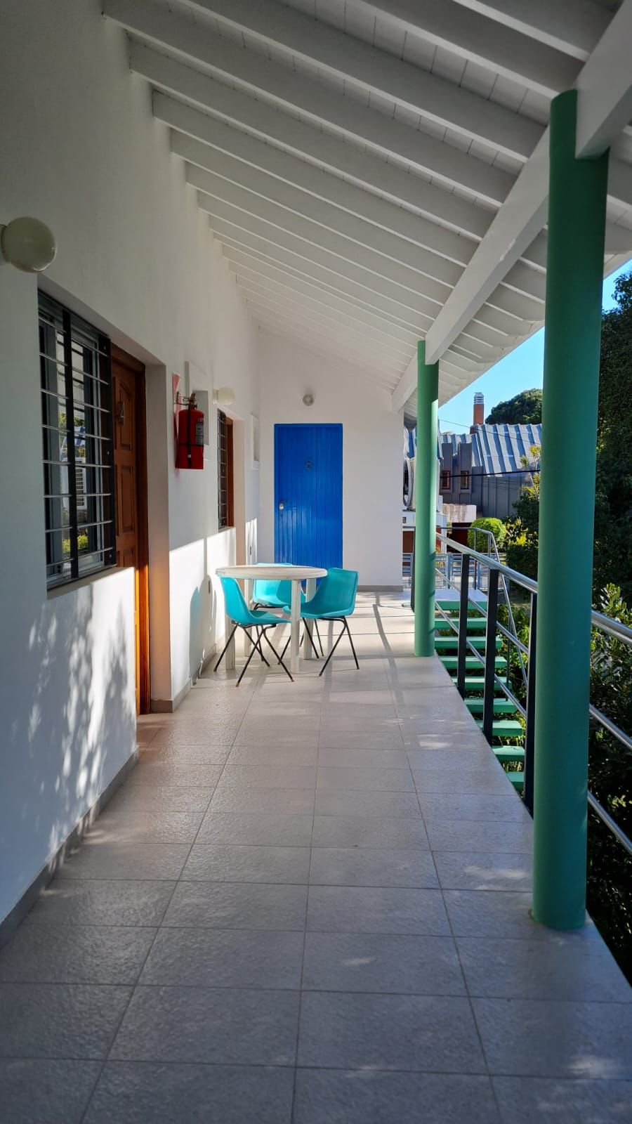 En exteriores, a ambos lados hay un pequeño jardín siempre muy verde y prolijo y en el fondo del Complejo se encuentra el quincho en donde el turista además de cocinar en las parrillas de uso común, también puede cocinar y lavar la vajilla en esos espacios comunes. Cada departamento está equipado con pava eléctrica un mínimo set de vajilla.
